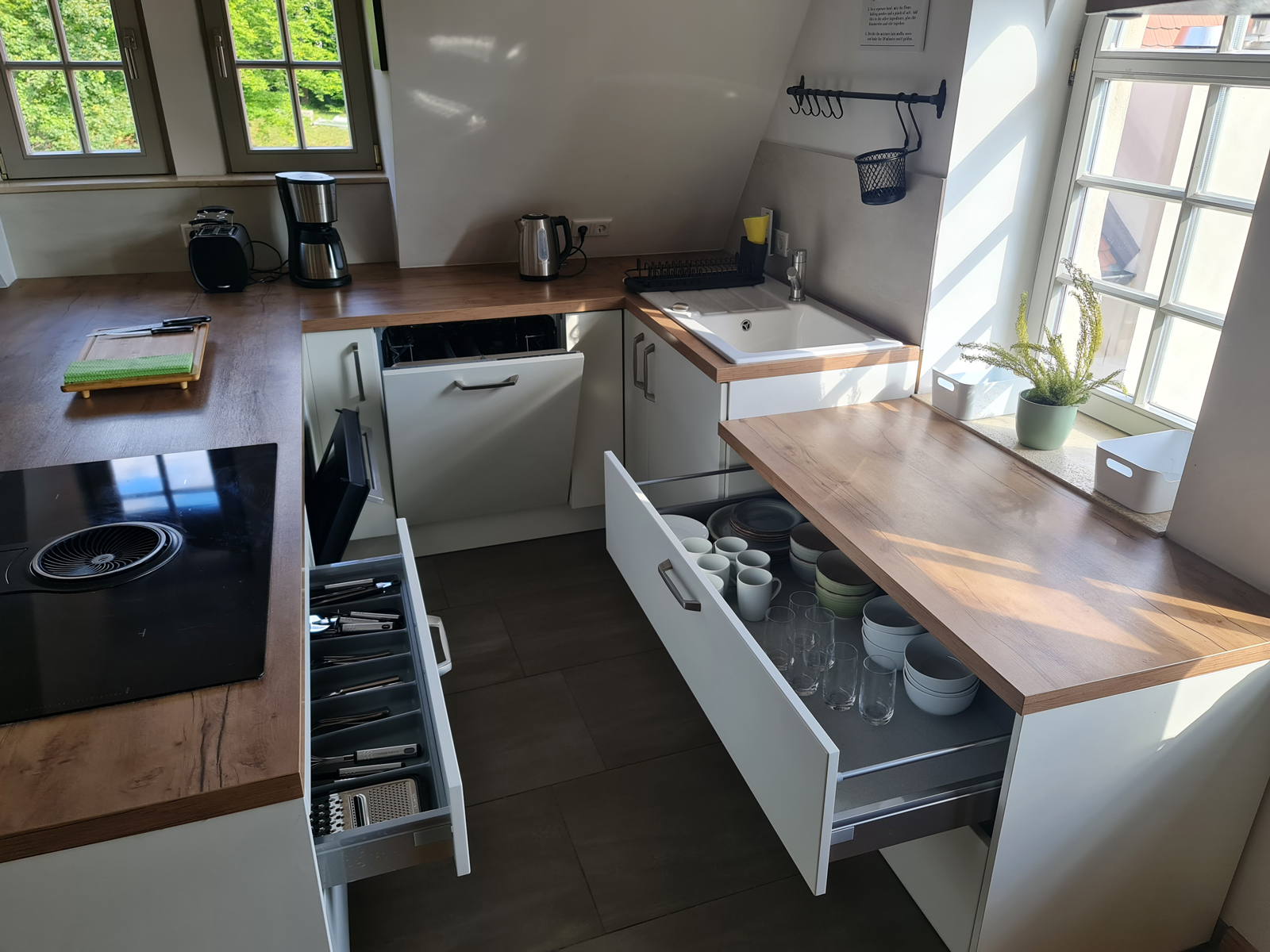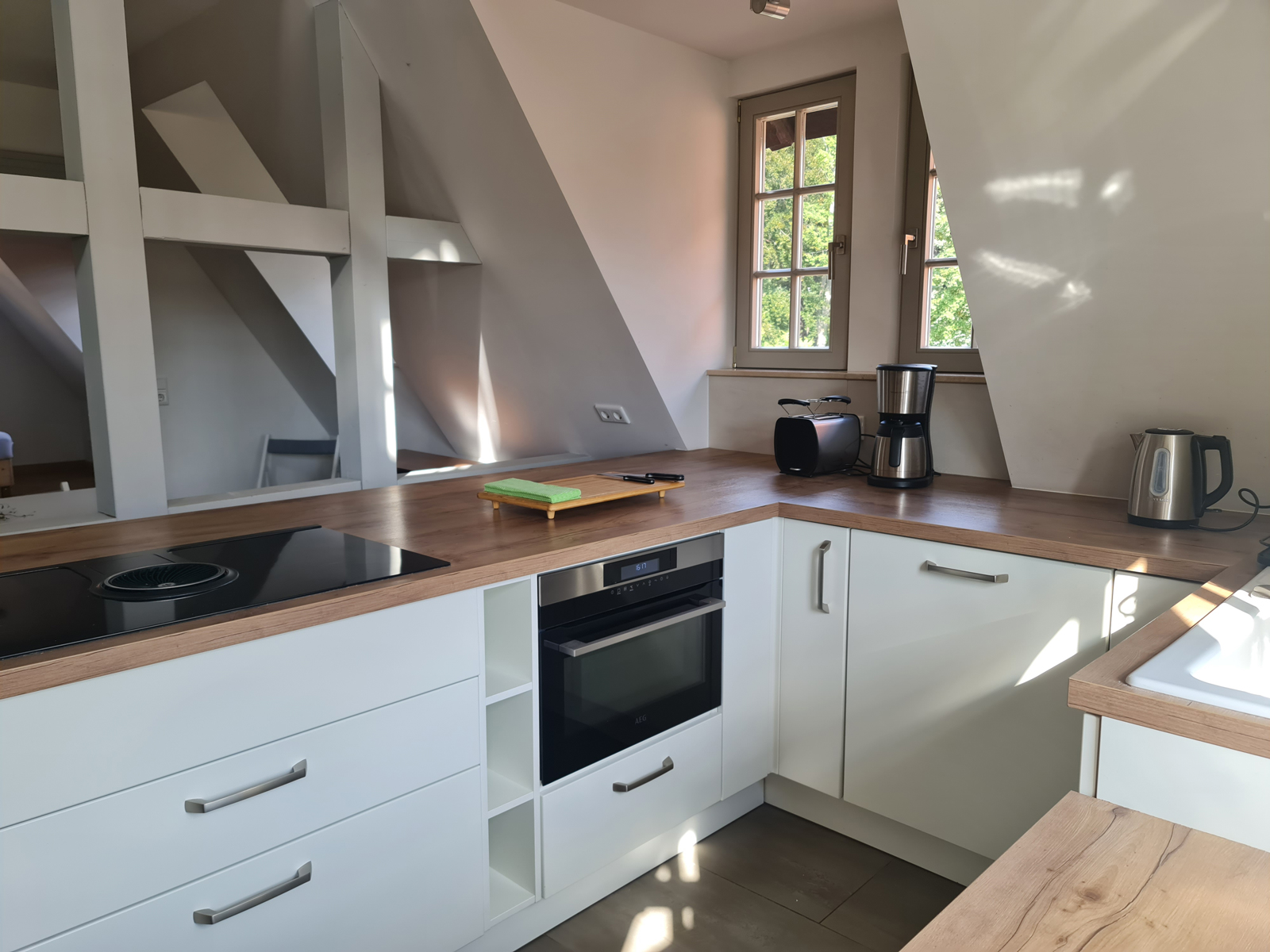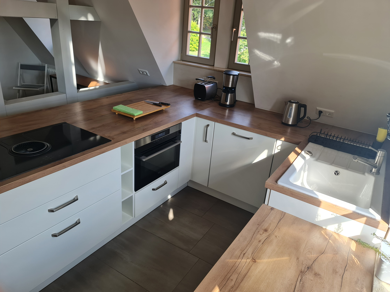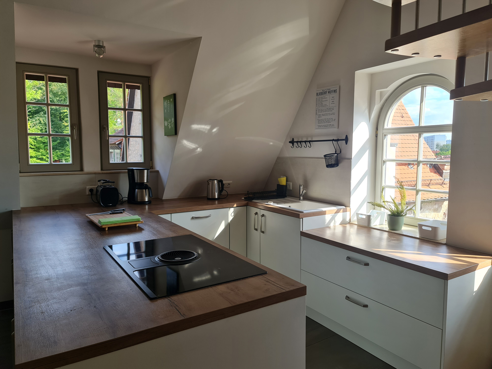 Die offene Küchenzeile ist mit Geschirrspüler, Herd, Backofen, Kühlschrank, Kaffeemaschine, Wasserkocher, Toaster und Mikrowelle ausgestattet. Die notwendigen Utensilien für den täglichen Bedarf in der Küche, sowie Besteck, Geschirr und Glaswaren sind auch vorhanden. Küche und Essbereich sind mit einer offenen Holzkonstruktion getrennt im gleichen Raum untergebracht. Die Wohnung hat 3 Separate Schlafzimmer mit jeweils 2 Betten (90 x 200) welche man je nach Bedarf als Doppel oder Einzelbett benutzen kann. Im Wohnzimmer befindet sich eine Schlafcouch und ein weiteres Bett mit Platz für zwei weitere Person. Bettwäsche und Handtücher sind vorhanden. Der eigene Burgpark lädt zum entspannten spazieren ein. Ein herrschaftliches Wohnambiente über den Dächern der Burganlage und Jenas.