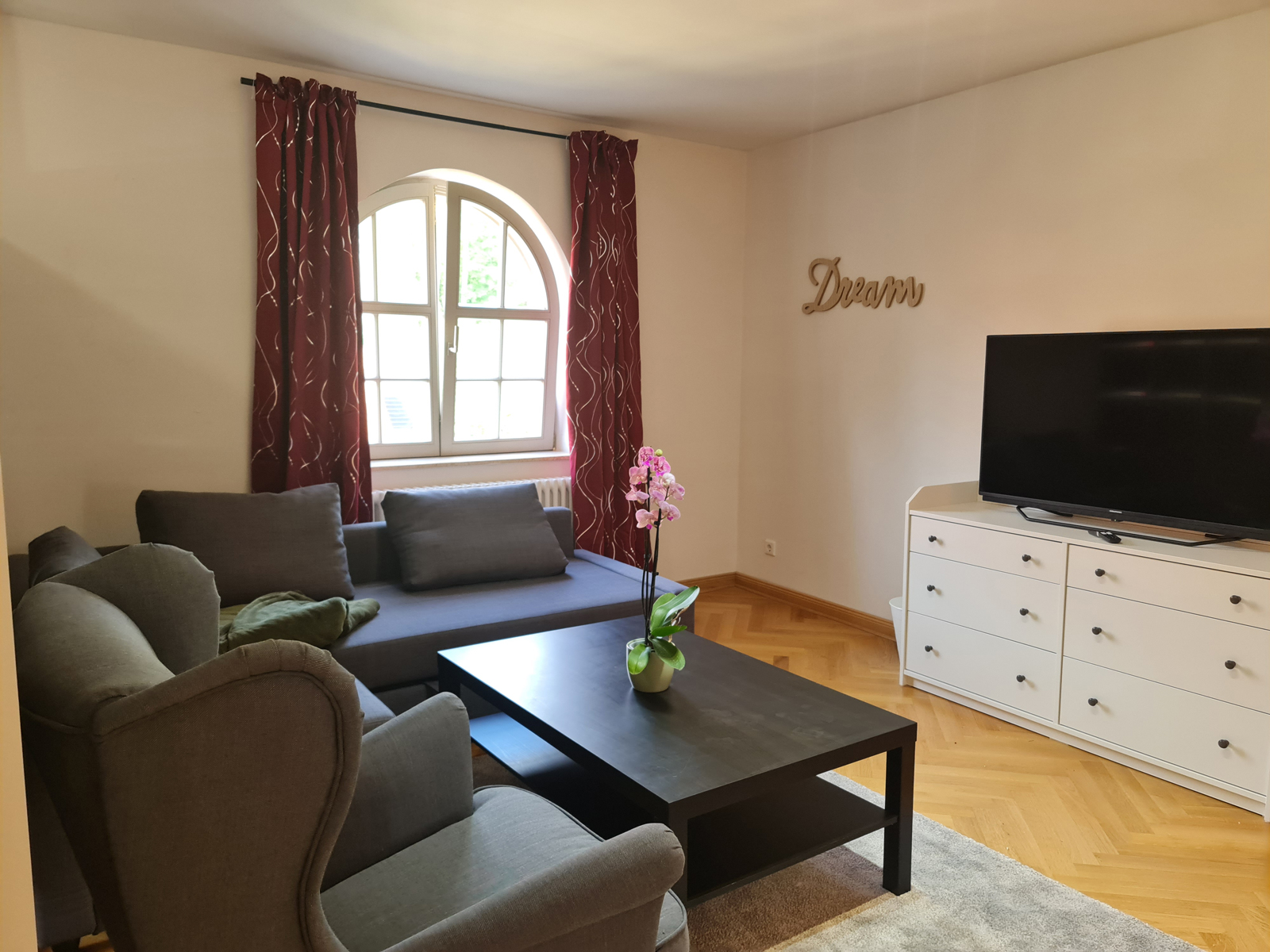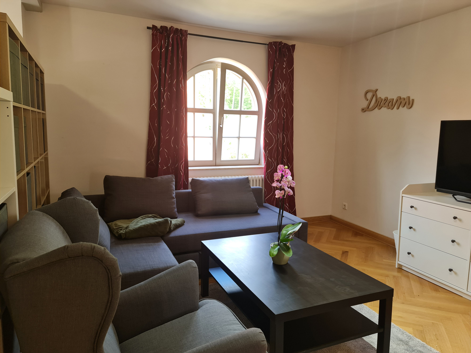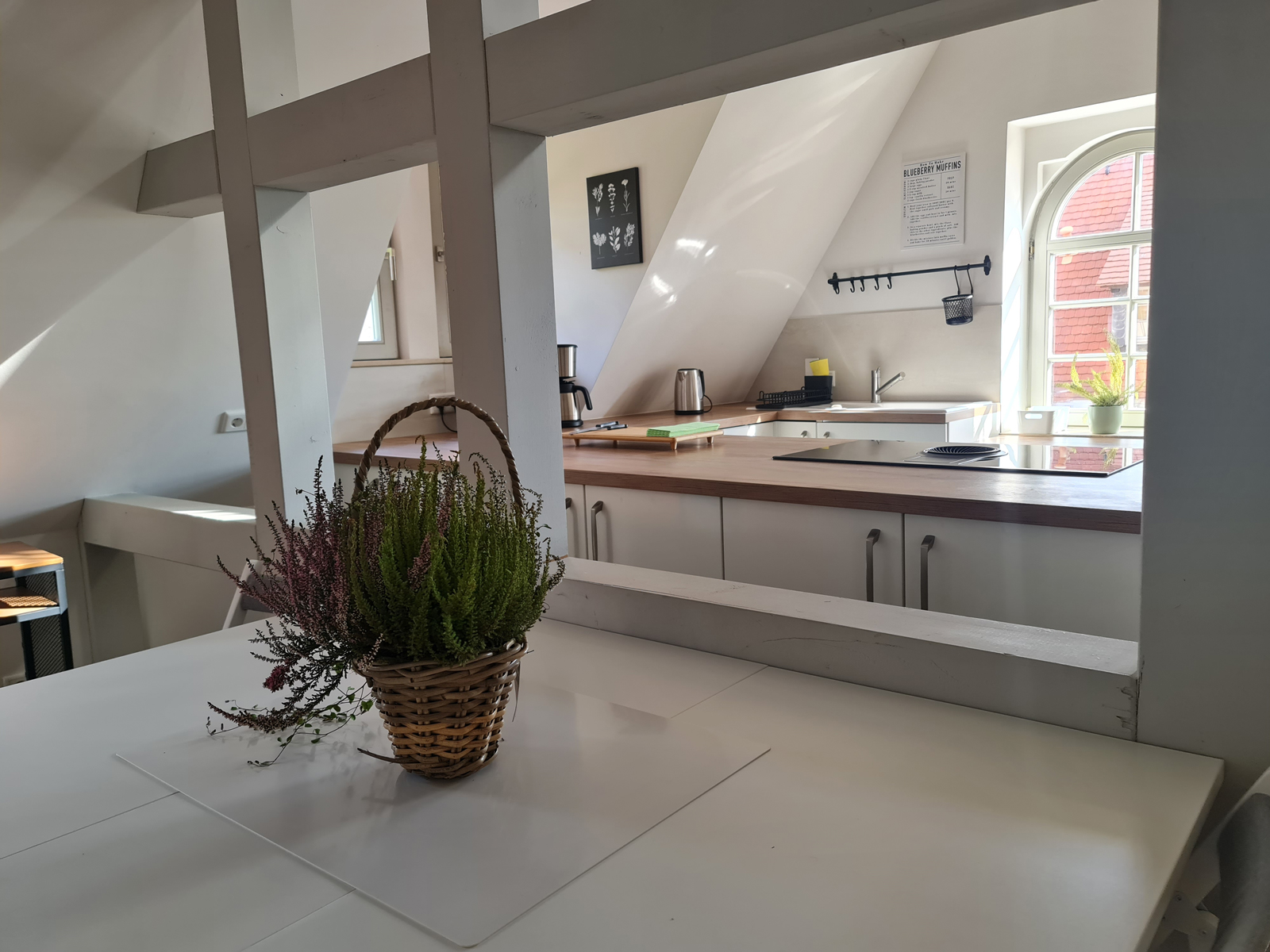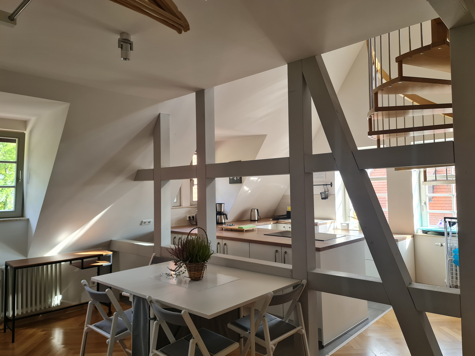 Die offene Küchenzeile ist mit Geschirrspüler, Herd, Backofen, Kühlschrank, Kaffeemaschine, Wasserkocher, Toaster und Mikrowelle ausgestattet. Die notwendigen Utensilien für den täglichen Bedarf in der Küche, sowie Besteck, Geschirr und Glaswaren sind auch vorhanden. Küche und Essbereich sind mit einer offenen Holzkonstruktion getrennt im gleichen Raum untergebracht. Die Wohnung hat 3 Separate Schlafzimmer mit jeweils 2 Betten (90 x 200) welche man je nach Bedarf als Doppel oder Einzelbett benutzen kann. Im Wohnzimmer befindet sich eine Schlafcouch und ein weiteres Bett mit Platz für zwei weitere Person. Bettwäsche und Handtücher sind vorhanden. Der eigene Burgpark lädt zum entspannten spazieren ein. Ein herrschaftliches Wohnambiente über den Dächern der Burganlage und Jenas.