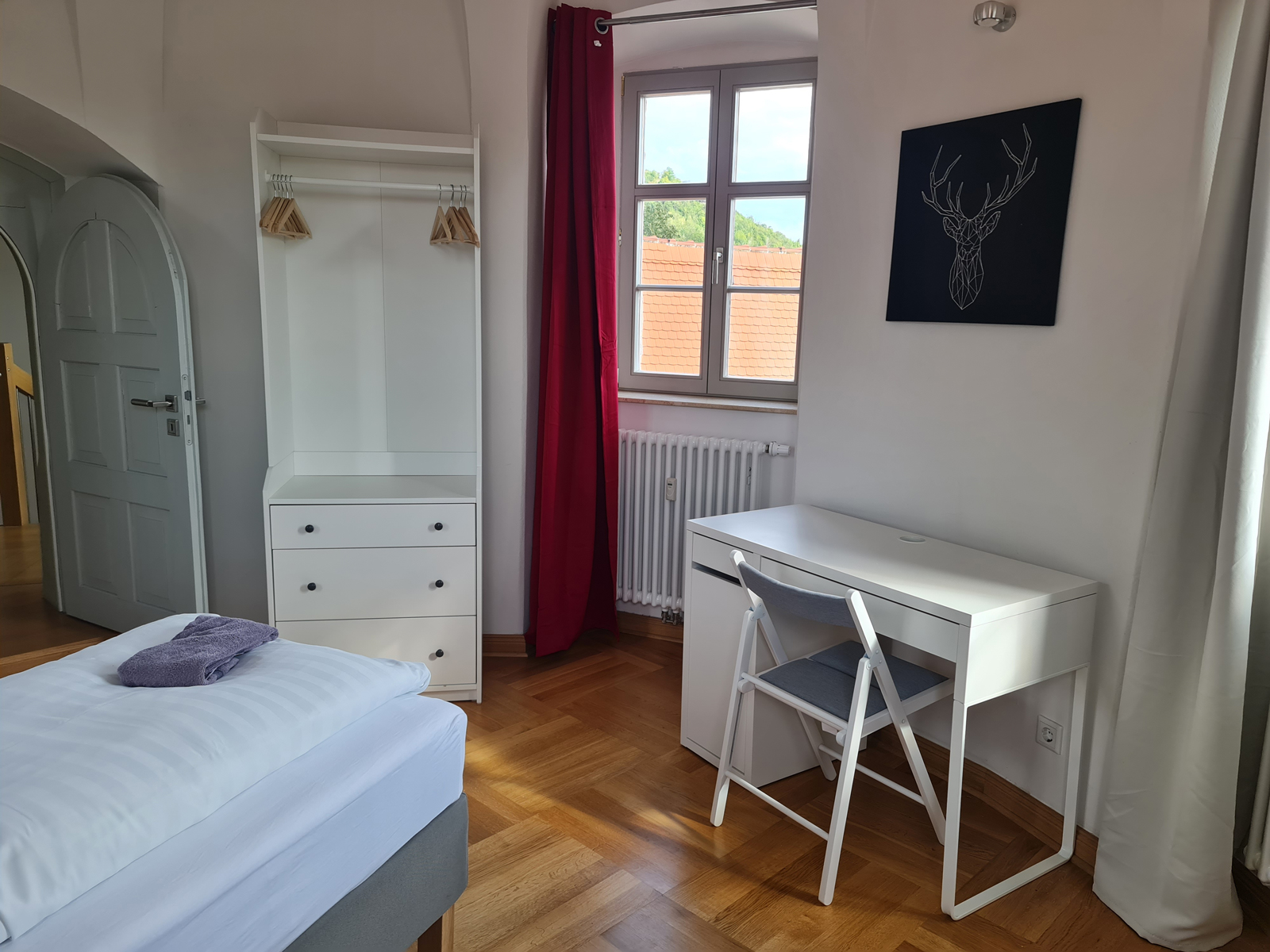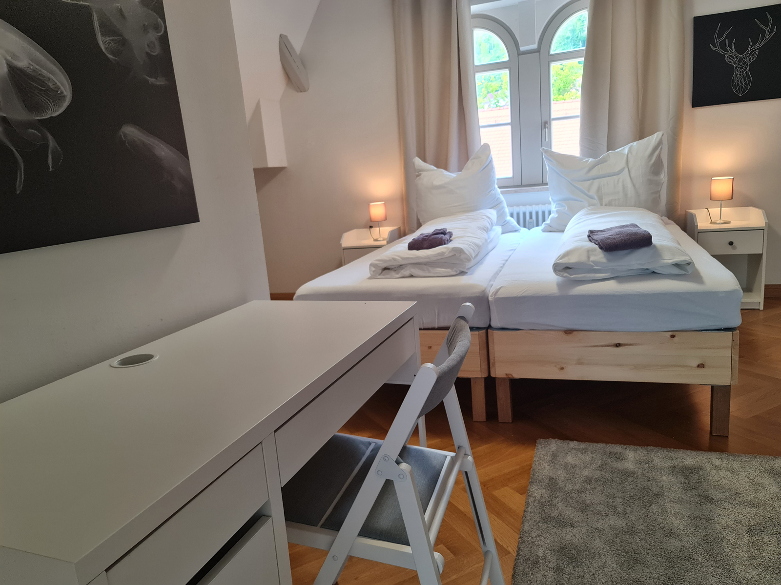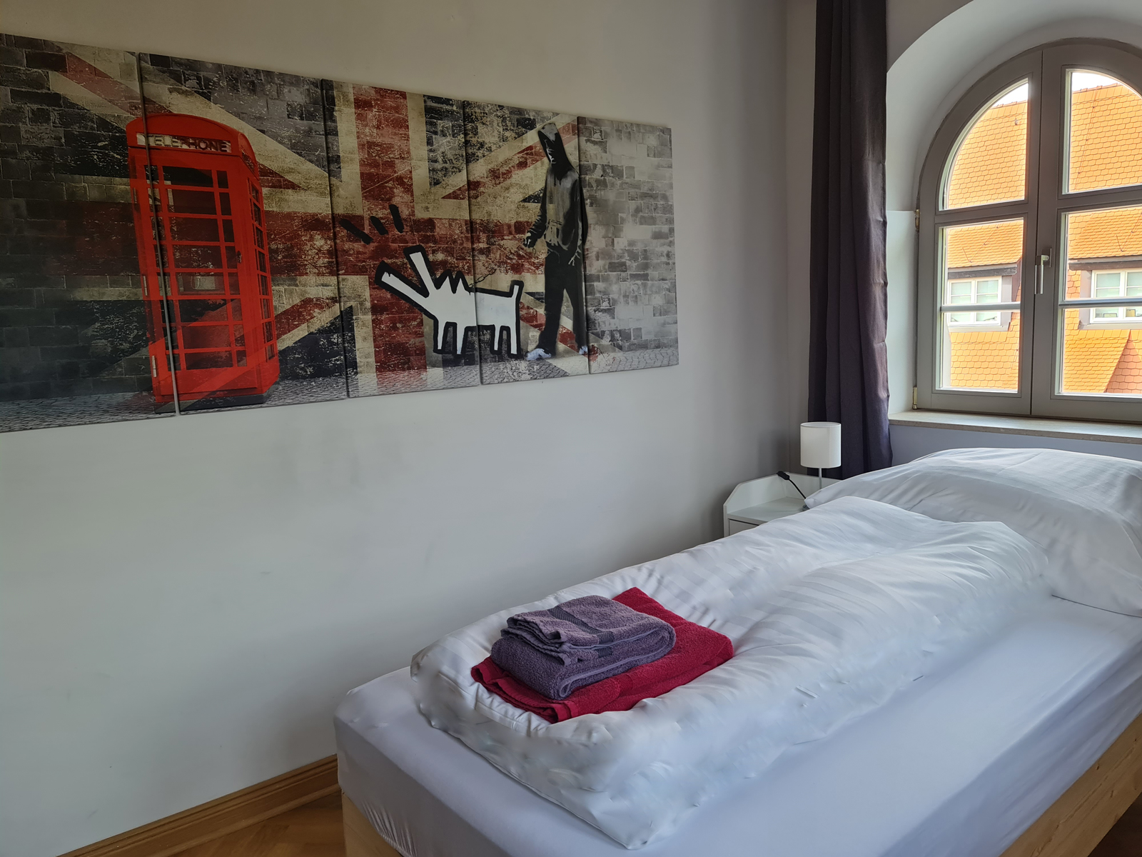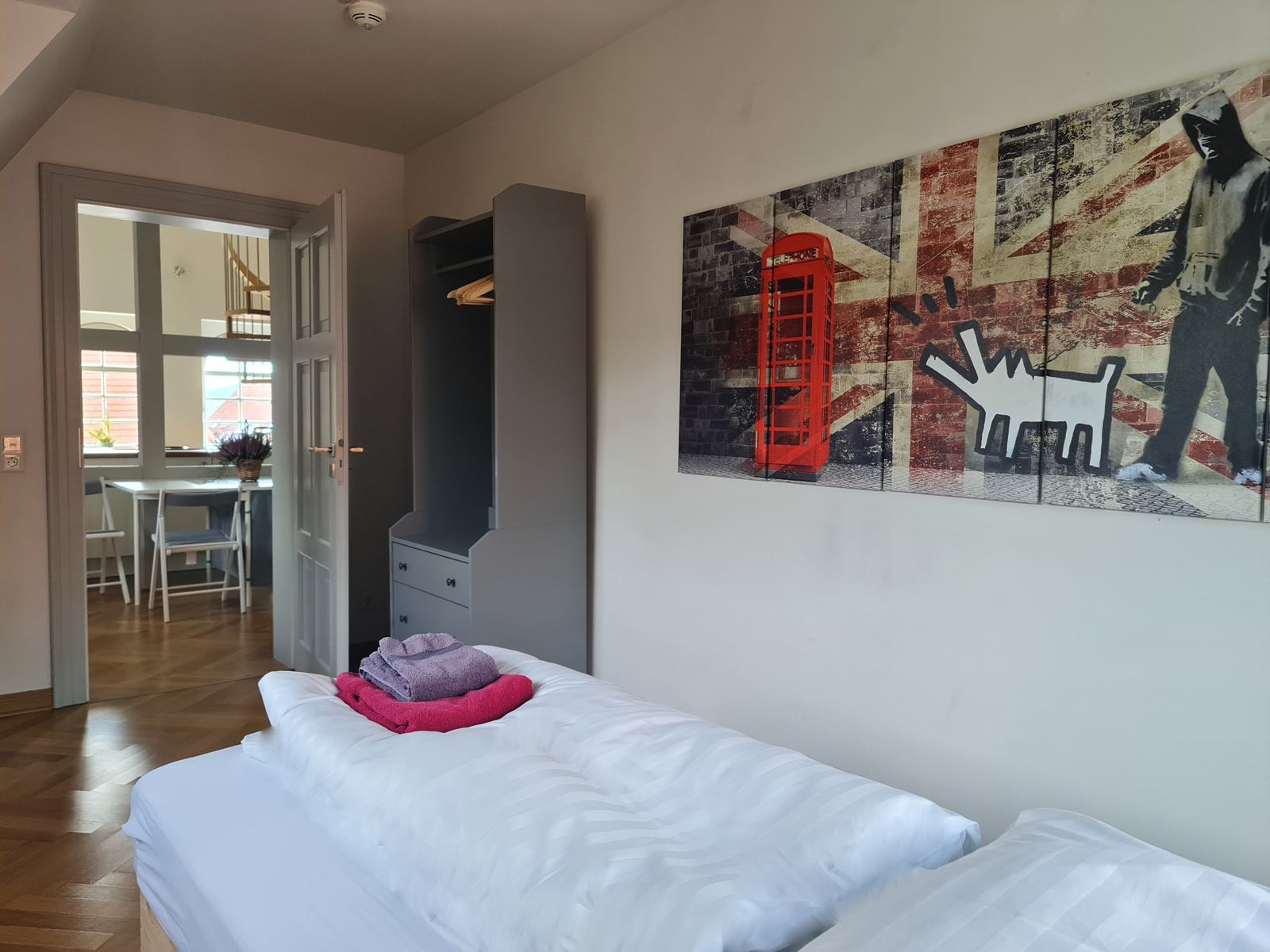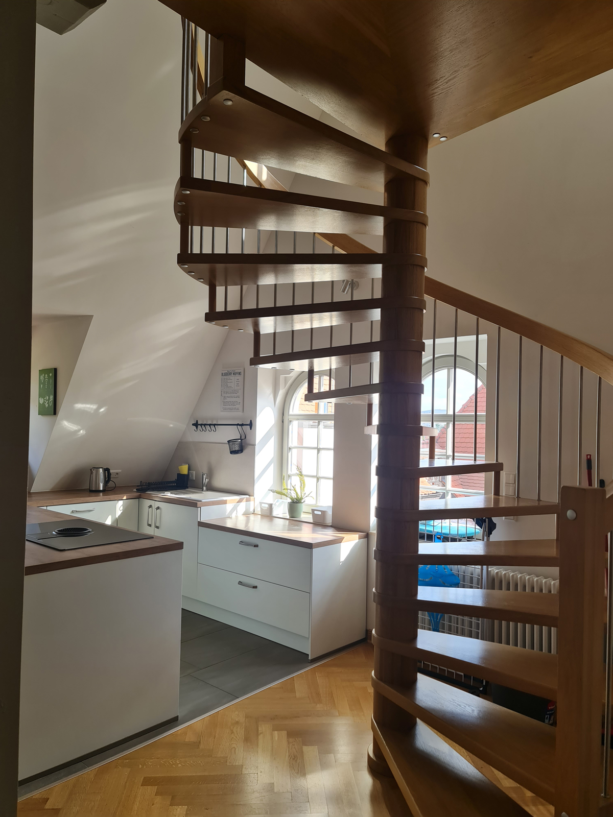 Die offene Küchenzeile ist mit Geschirrspüler, Herd, Backofen, Kühlschrank, Kaffeemaschine, Wasserkocher, Toaster und Mikrowelle ausgestattet. Die notwendigen Utensilien für den täglichen Bedarf in der Küche, sowie Besteck, Geschirr und Glaswaren sind auch vorhanden. Küche und Essbereich sind mit einer offenen Holzkonstruktion getrennt im gleichen Raum untergebracht. Die Wohnung hat 3 Separate Schlafzimmer mit jeweils 2 Betten (90 x 200) welche man je nach Bedarf als Doppel oder Einzelbett benutzen kann. Im Wohnzimmer befindet sich eine Schlafcouch und ein weiteres Bett mit Platz für zwei weitere Person. Bettwäsche und Handtücher sind vorhanden. Der eigene Burgpark lädt zum entspannten spazieren ein. Ein herrschaftliches Wohnambiente über den Dächern der Burganlage und Jenas.