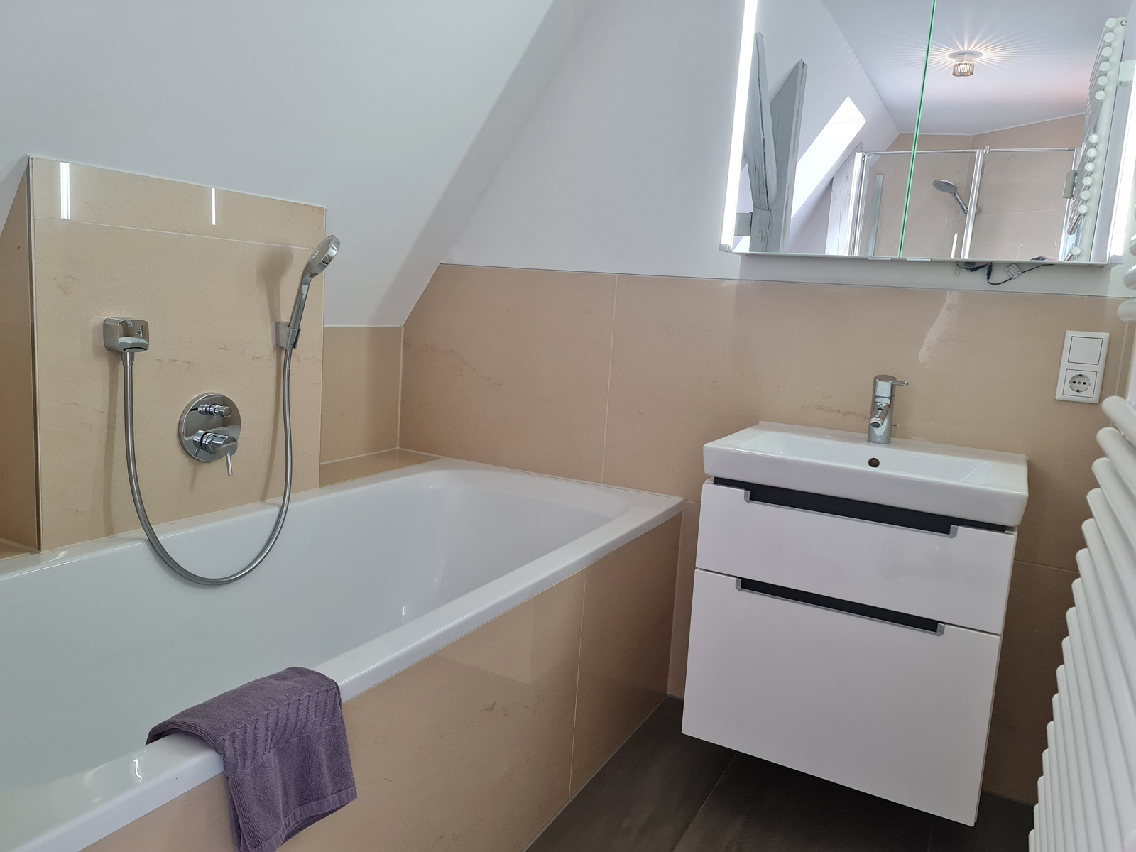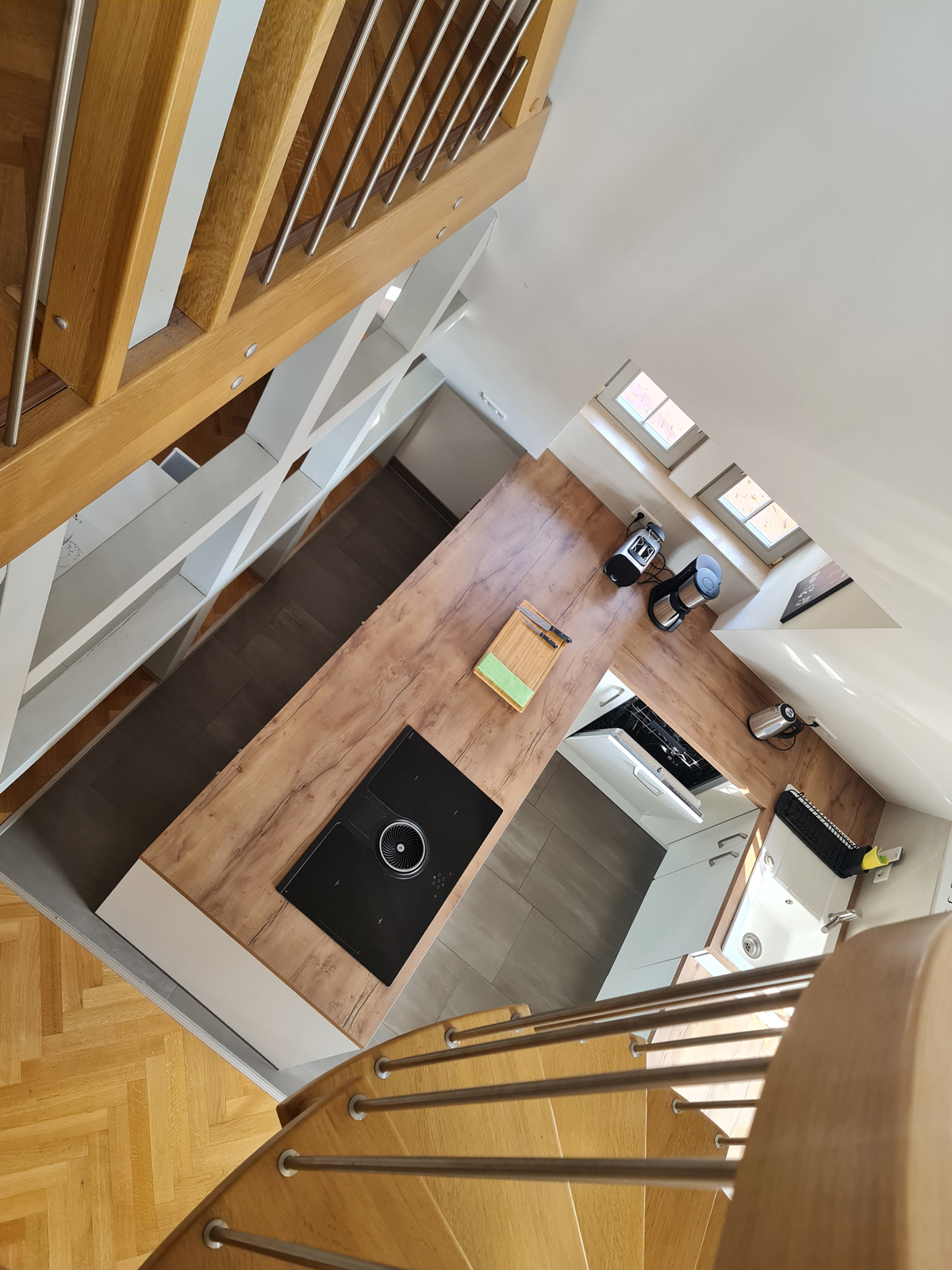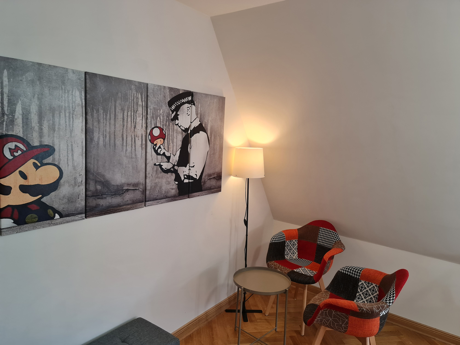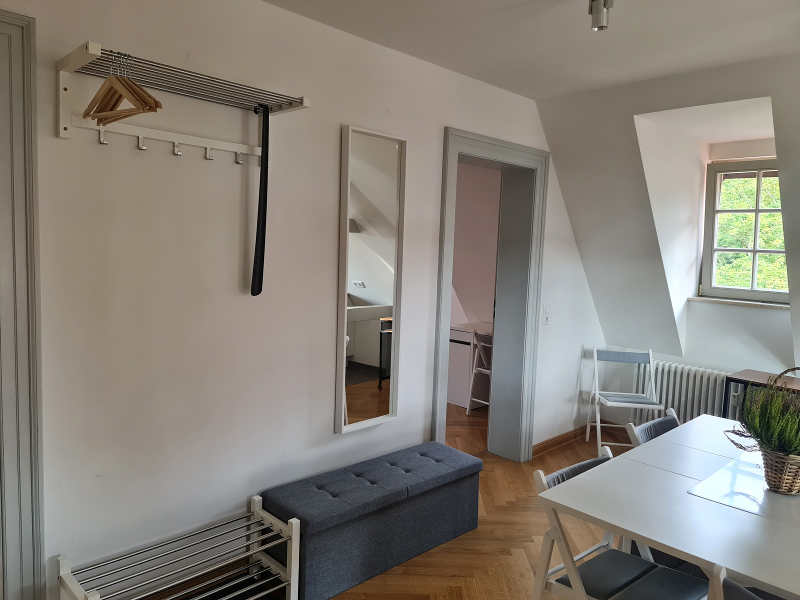 Die offene Küchenzeile ist mit Geschirrspüler, Herd, Backofen, Kühlschrank, Kaffeemaschine, Wasserkocher, Toaster und Mikrowelle ausgestattet. Die notwendigen Utensilien für den täglichen Bedarf in der Küche, sowie Besteck, Geschirr und Glaswaren sind auch vorhanden. Küche und Essbereich sind mit einer offenen Holzkonstruktion getrennt im gleichen Raum untergebracht. Die Wohnung hat 3 Separate Schlafzimmer mit jeweils 2 Betten (90 x 200) welche man je nach Bedarf als Doppel oder Einzelbett benutzen kann. Im Wohnzimmer befindet sich eine Schlafcouch und ein weiteres Bett mit Platz für zwei weitere Person. Bettwäsche und Handtücher sind vorhanden. Der eigene Burgpark lädt zum entspannten spazieren ein. Ein herrschaftliches Wohnambiente über den Dächern der Burganlage und Jenas.