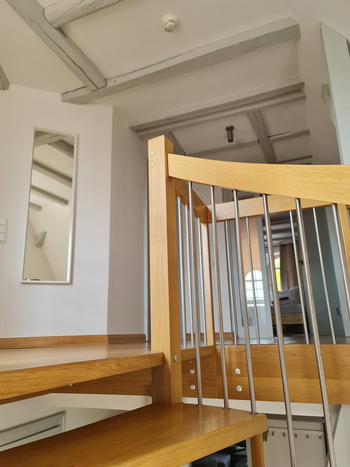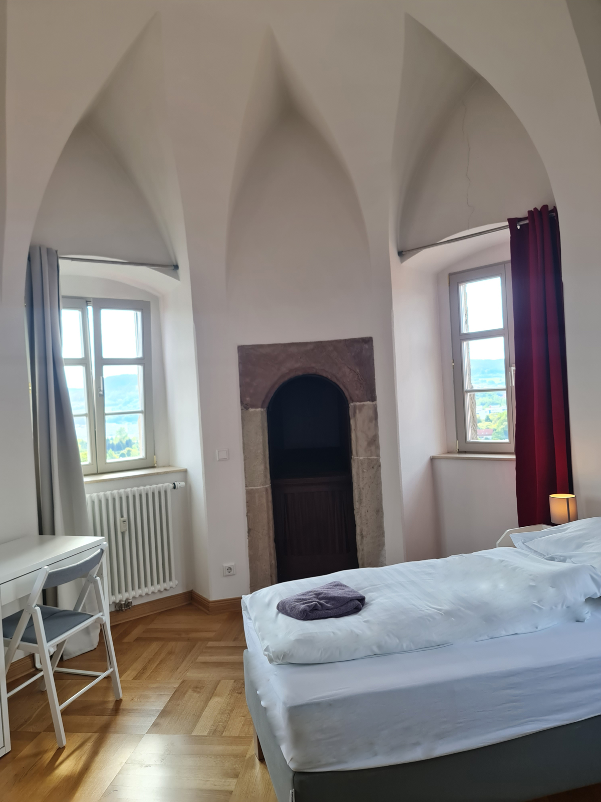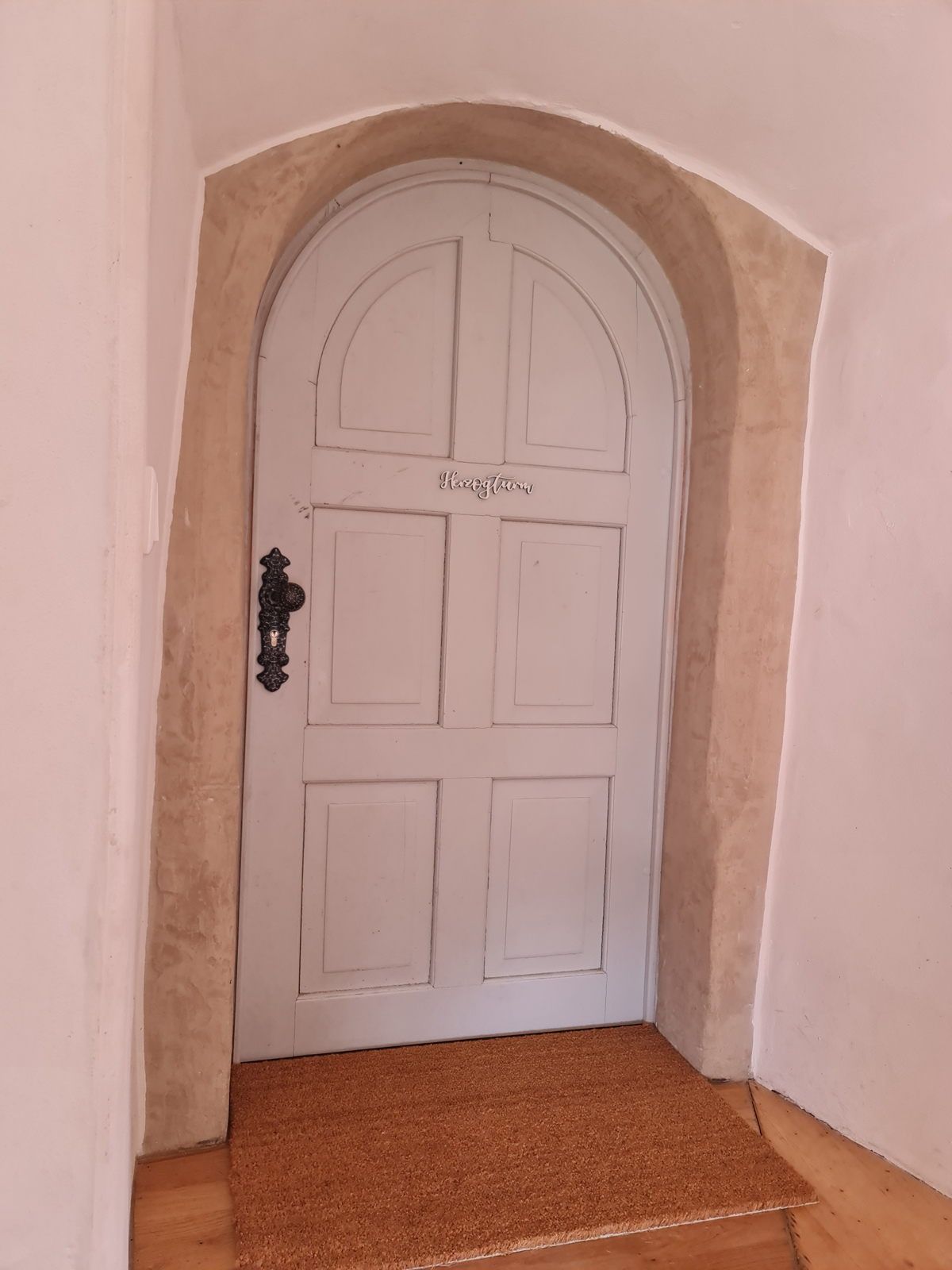Beim Herzogturm handelt es sich um eine Maisonettwohnung im Turm der Burg. Auf 2,5 Etagen befinden sich 3 Schlafzimmer, eine große Küche mit Essecke, ein Wohnzimmer und einem Bad im unteren Bereich mit Dusche und der Waschmaschine sowie ein Bad im oberen Bereich mit Dusche und Badewanne. Hohe Decken und die offenen Dachbalken im Eingangsbereich vermitteln ein tolles Wohngefühl.