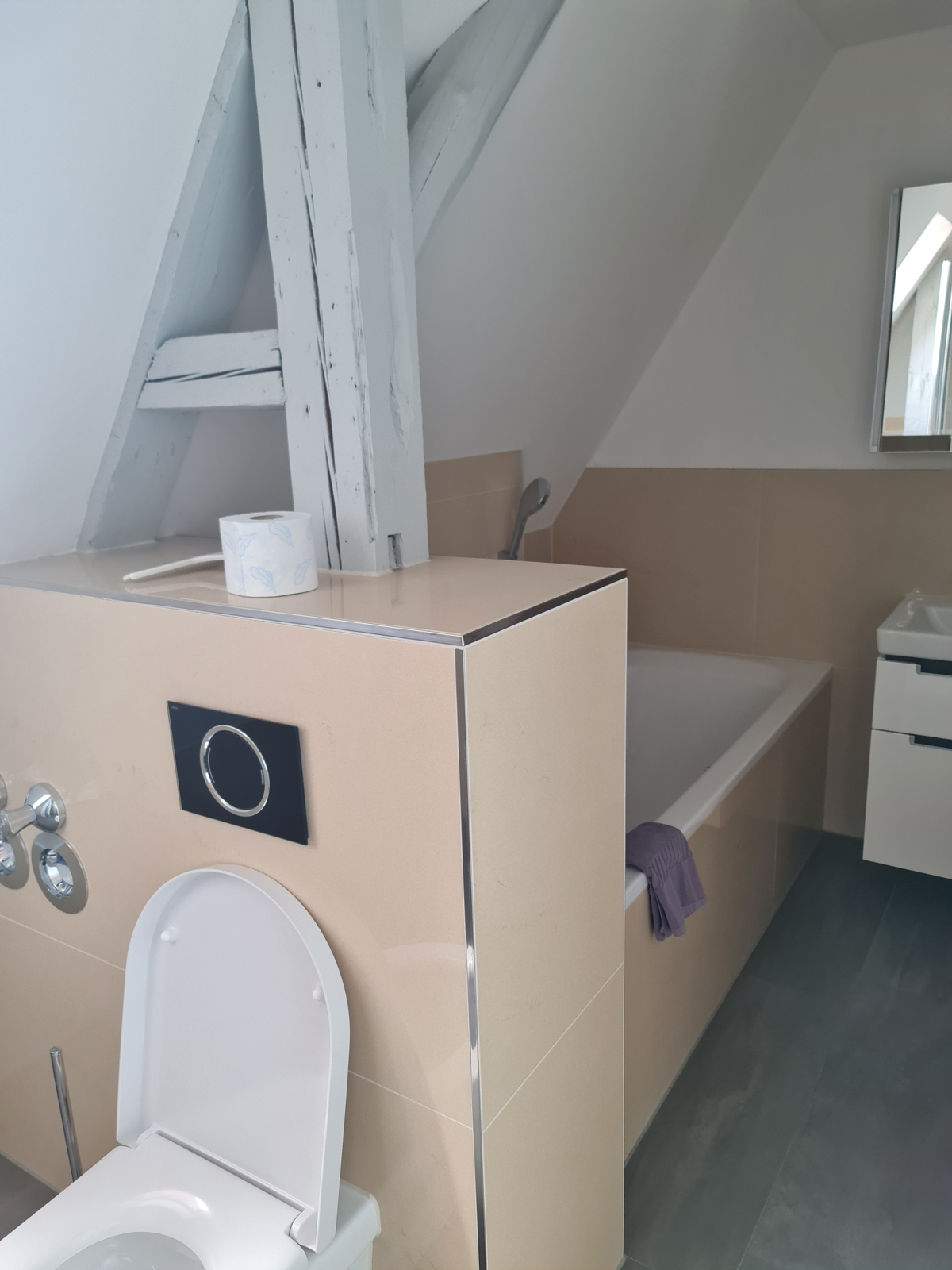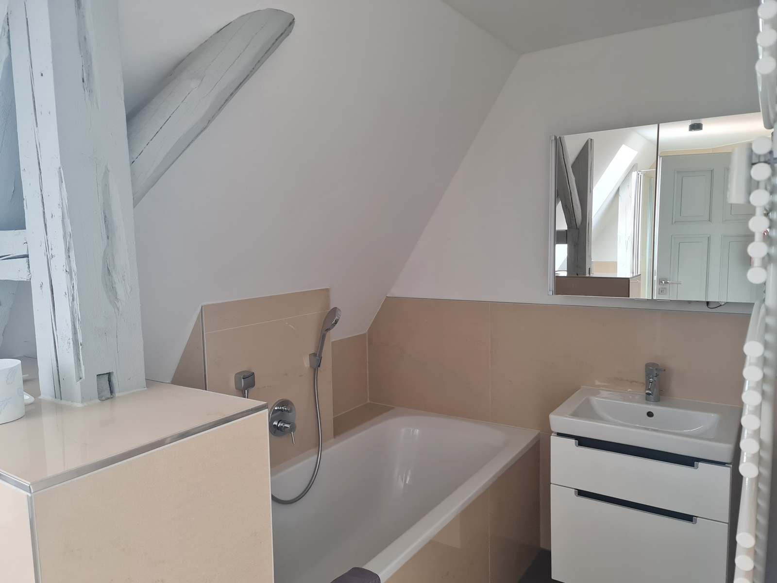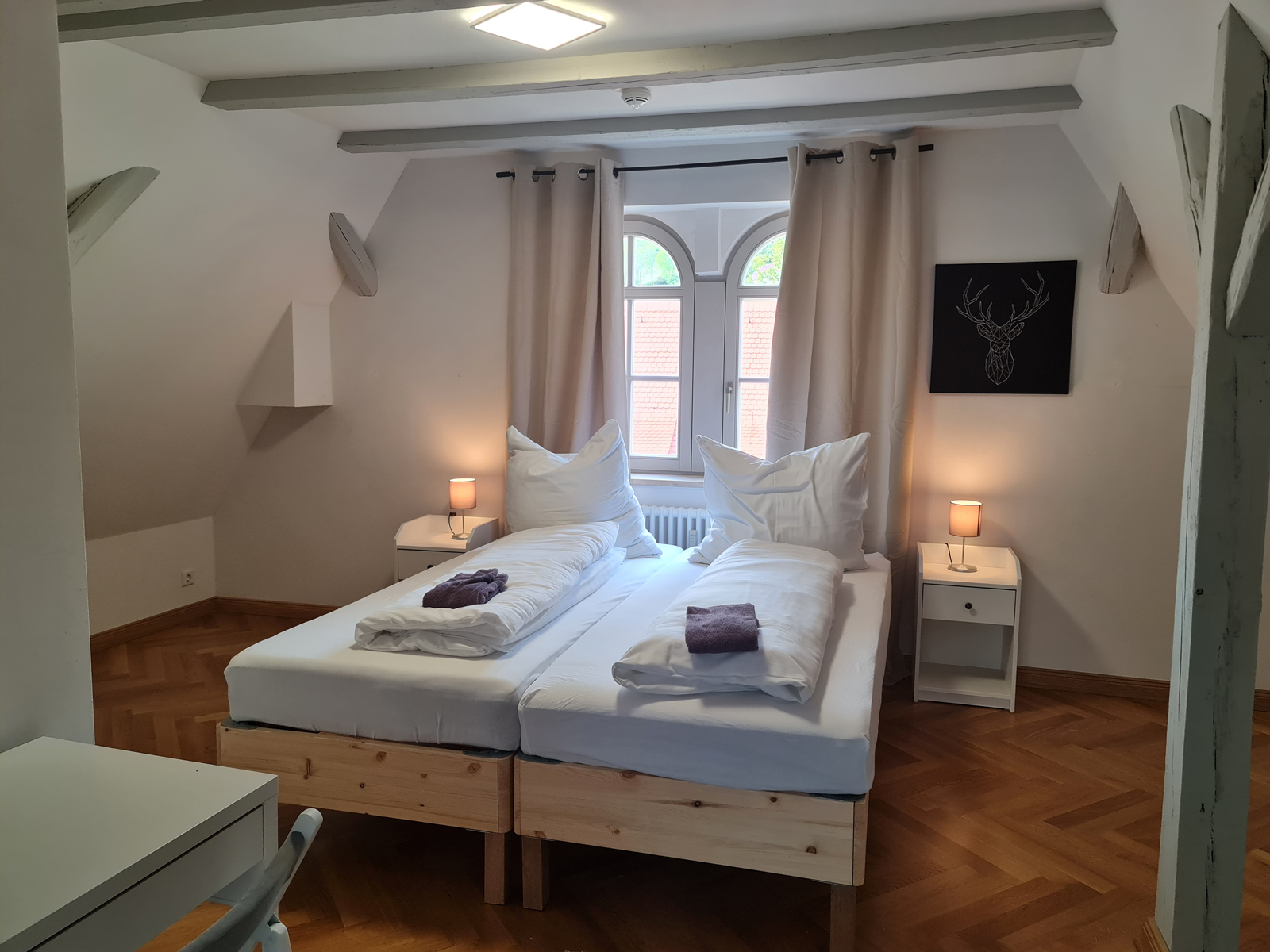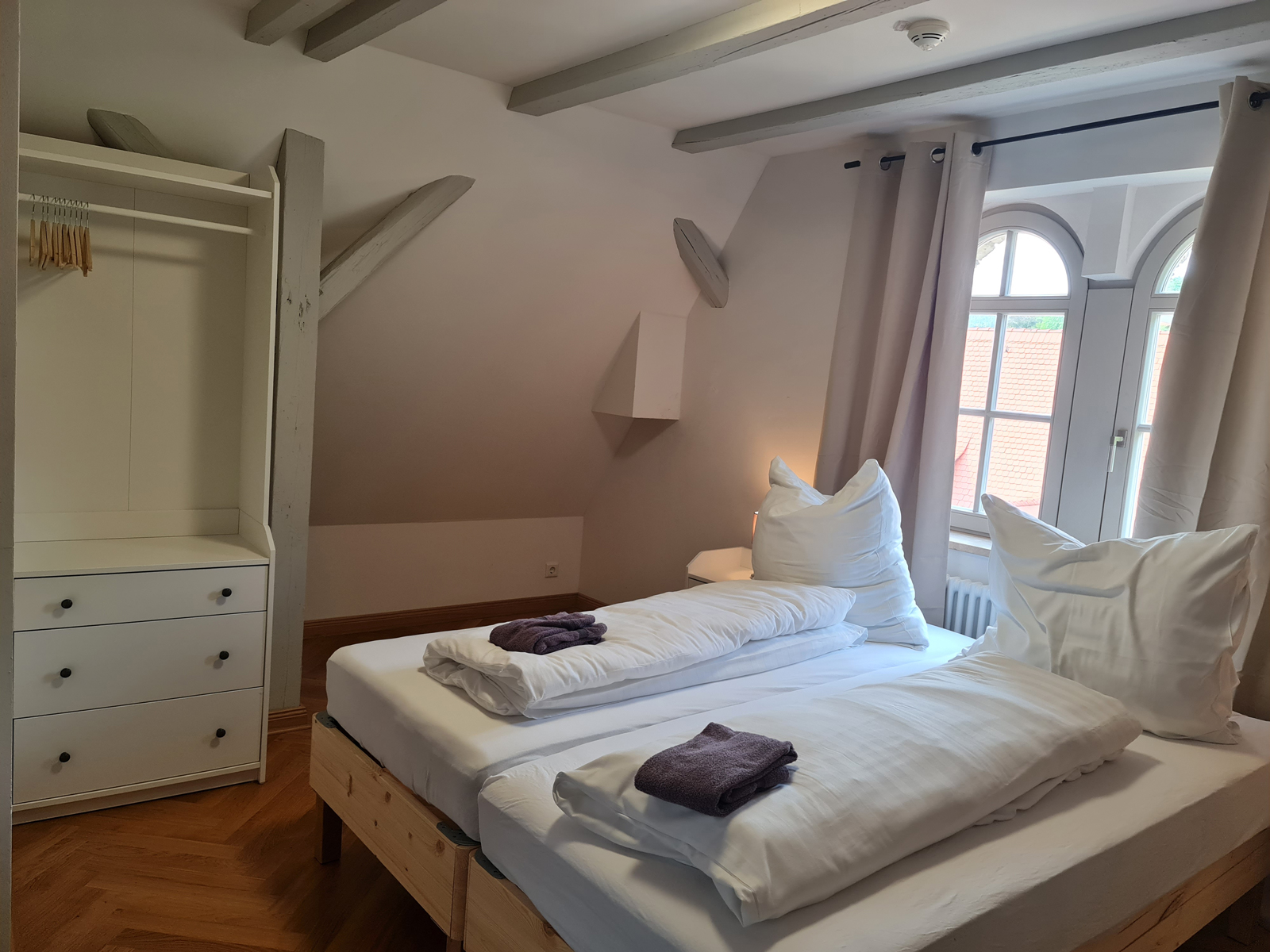 Beim Herzogturm handelt es sich um eine Maisonettwohnung im Turm der Burg. Auf 2,5 Etagen befinden sich 3 Schlafzimmer, eine große Küche mit Essecke, ein Wohnzimmer und einem Bad im unteren Bereich mit Dusche und der Waschmaschine sowie ein Bad im oberen Bereich mit Dusche und Badewanne. Hohe Decken und die offenen Dachbalken im Eingangsbereich vermitteln ein tolles Wohngefühl.
